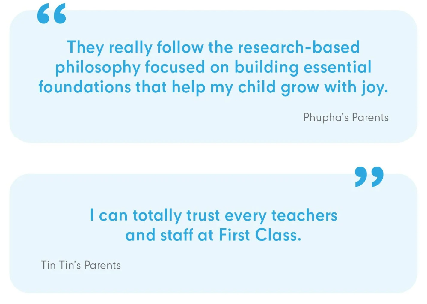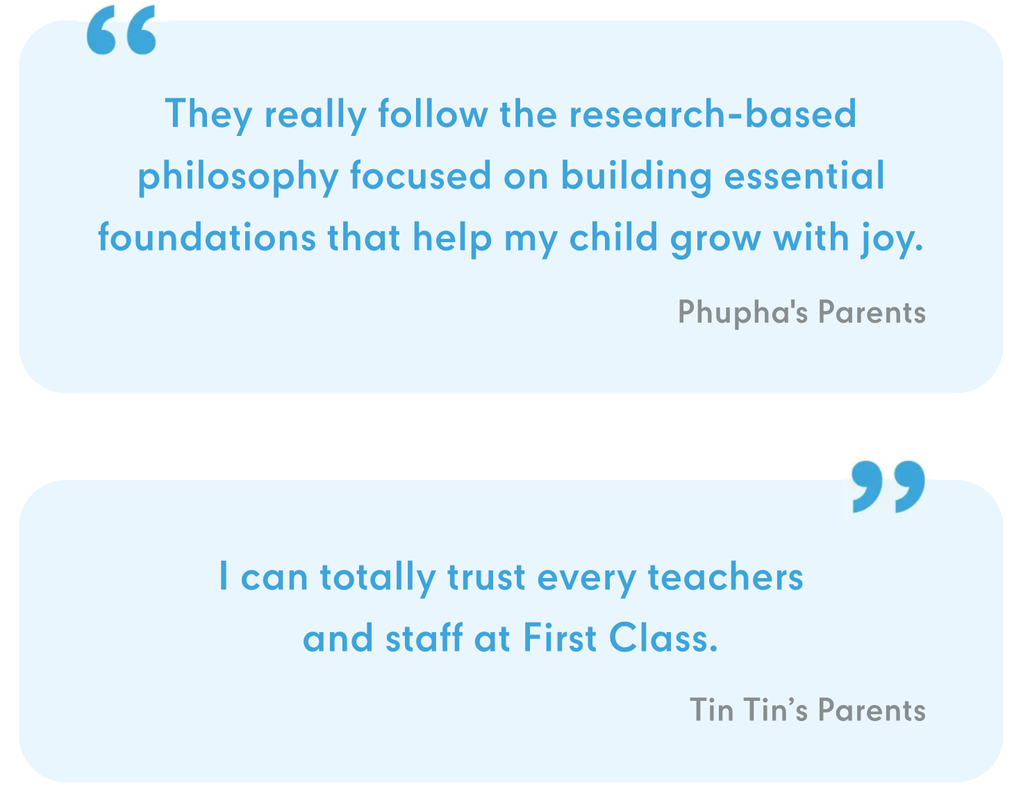 First Class Preschool believes that the quality of relationships formed during early childhood is a crucial starting point for learning about oneself and the world around them, shaping attitudes towards themselves and the world, as well as developing ways to adapt and live happily in this world in the future.